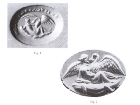 "Ce motif de l'union de Léda et du cygne est bien connu dans l' iconographie du monde occidental et connaît à l' époque romaine et jusqu' à la fin de l' Antiquité un immense succès. On le trouve aussi sur un sceau qui porte une inscription pehlevie (fig. 1). On y voit une Léda nue à moitié étendue sur un rocher. Un grand cygne avec des ailes déployées est assis entre ses jambes et l' embrasse. En comparant l' exécution du motif sur le sceau sassanide avec des motifs analogues sur des sceaux romains (fig. 2), on est frappé par l' analogie de la composition, mais aussi par le schématisme de l' exécution sassanide. Sur le sceau sassanide le personnage ne présente aucun trait typiquement féminin et on ne distingue pas non plus l' habituel drapé qui couvre la jambe gauche et le bras droit de Léda. De plus, l' aile droite du cygne est atrophiée. Il est impossible de décider si la pauvreté de la gravure est due au fait que le graveur a imité un motif dont il ne comprenait pas tous les aspects, ou si la raison est tout simplement le talent médiocre du graveur.